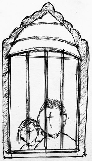 having a window with vertical bars facing the courtyard. My dad and I looked through the window and pretended as if my mom had captured us inside, while she clicked a picture.